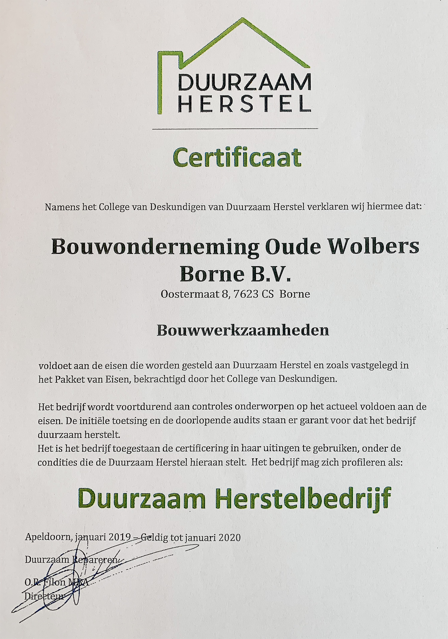 Onlangs hebben we een externe audit controle gehad als Duurzaam Herstelbedrijf. Tijdens de audit wordt het proces van op een duurzame manier repareren, herstellen en/of onderhoud uitvoeren aan woningen en bedrijfspanden, onder de loep genomen. We zijn natuurlijk geslaagd! Bouwonderneming Oude Wolbers streeft naar het leveren van optimale kwaliteit op een duurzame manier. Het wederom behalen van dit certificaat ligt in lijn met deze doelstelling. We gaan door naar onze re-certificering voor de aankomende jaren.