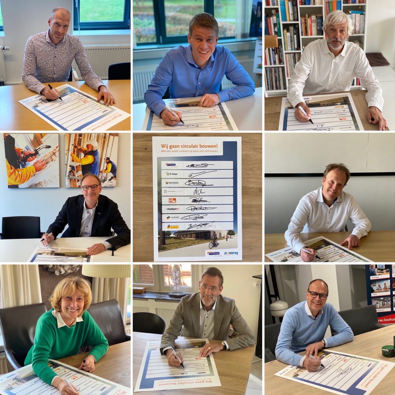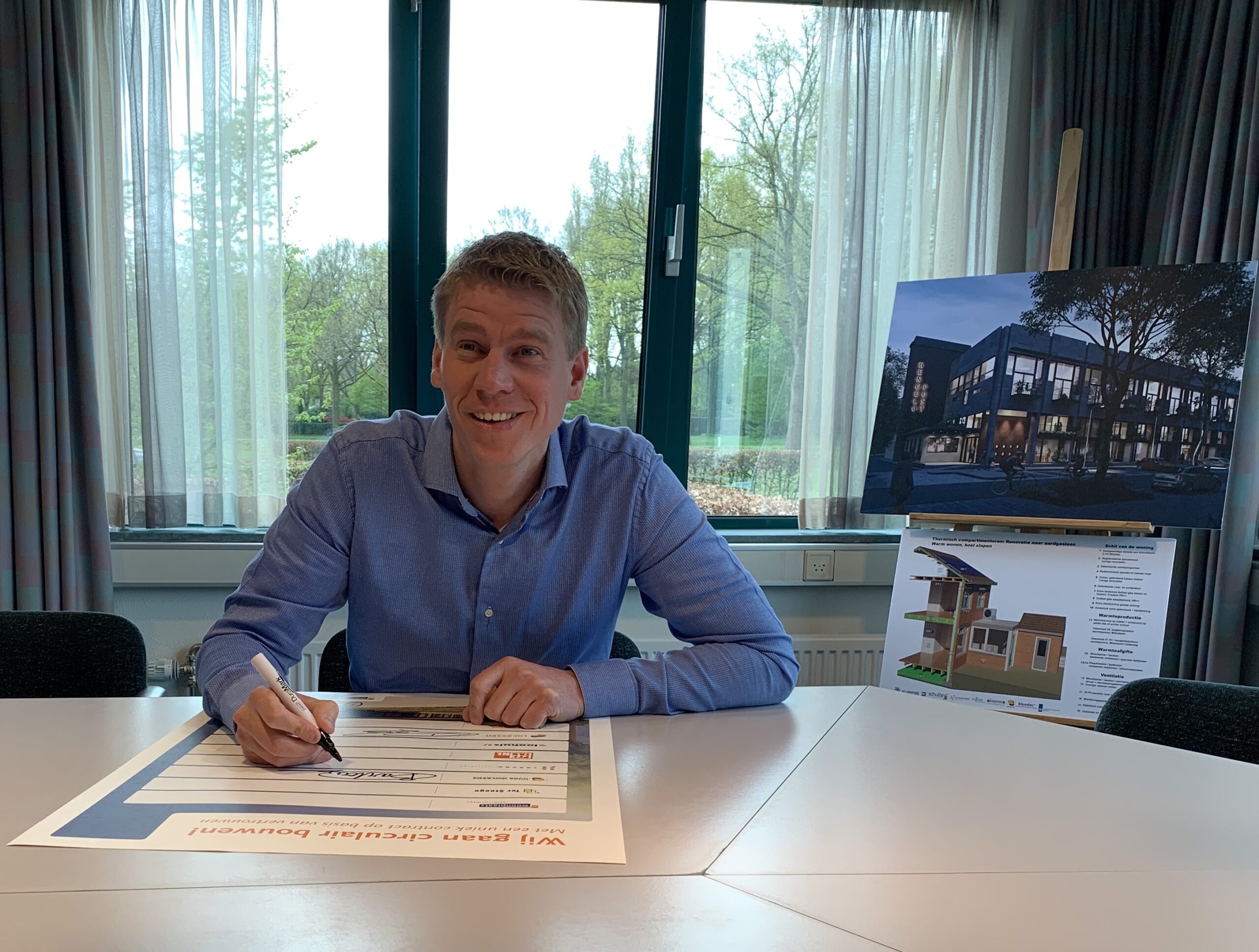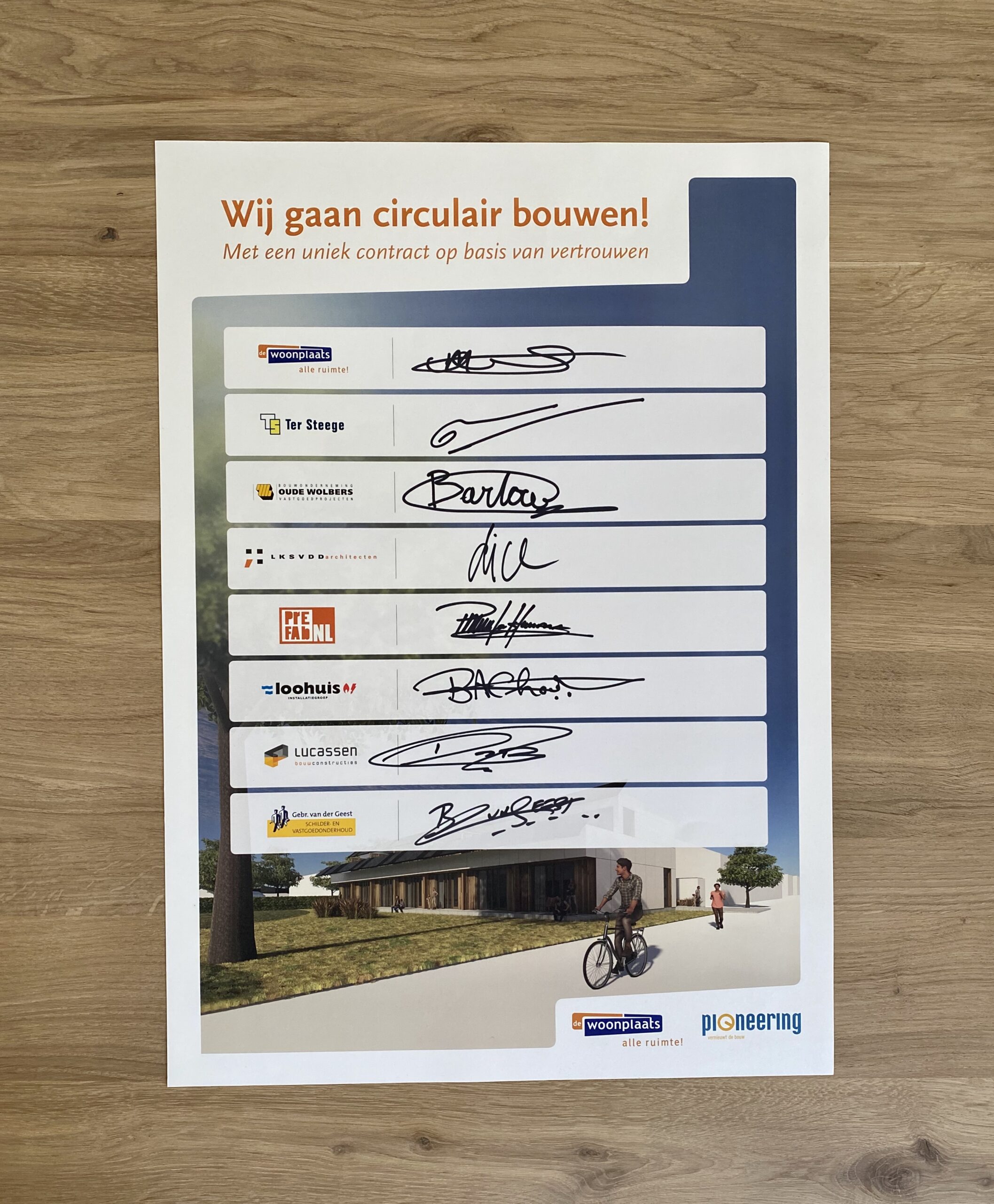 Op donderdag 16 april is het contract ondertekend tussen woningcorporatie De Woonplaats en een consortium van zeven partijen onder leiding van Bouwonderneming Oude Wolbers en Ter Steege Bouw Vastgoed. Een unieke contractvorm, op basis van vertrouwen, betekent de officiële start van het bouwen met herbruikbaar materiaal.