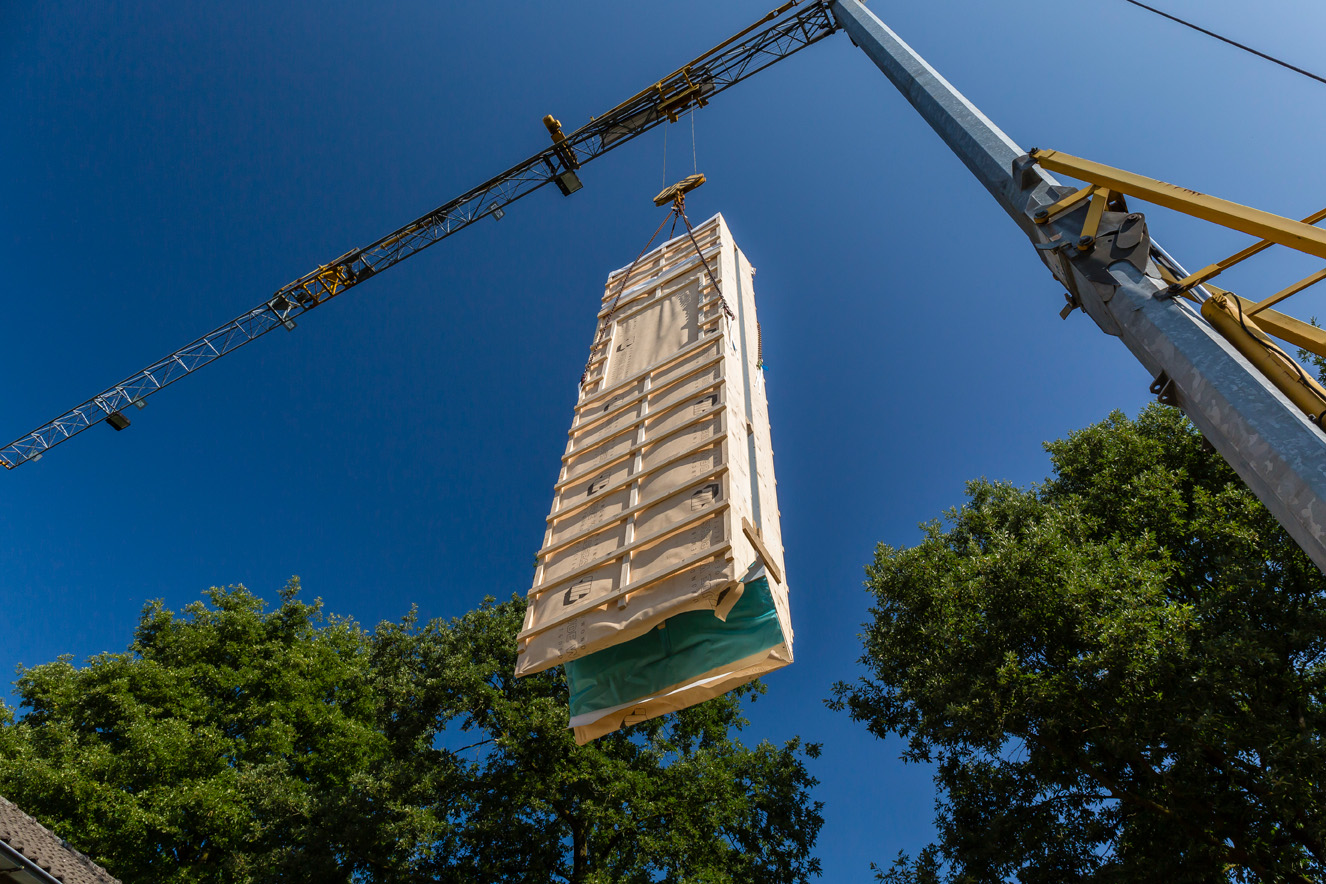 Voor een groot onderhoud project wordt Johan gevraagd of hij de kappen op de woningen wil zetten met de kraan. Gezien zijn kraanervaring neemt Johan dit werkt graag op zich. Met nog diverse cursussen mag Johan alle kraanmachinisttaken verrichten die nodig zijn. Complete daken, voorzetgevels en overstekken worden in de werkplaats bij Oude Wolbers geprefabriceerd en vervoerd naar de bouwlocatie. Vanaf dat moment neemt Johan het precisiewerk over. ‘Het gevoel om zo’n grote kraan te bedienen en dat je onderdelen op of aan de woningen plaatst is machtig!’ zegt Johan met een glimlach om zijn mond.